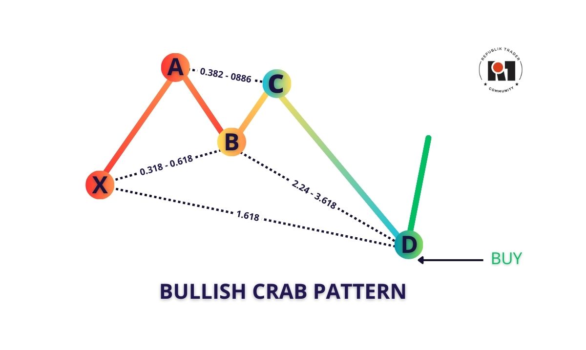 Pola Crab terdiri dari lima titik utama: X, A, B, C, dan D, serta empat pergerakan harga: XA, AB, BC, dan CD. Kaki CD memiliki ekstensi yang sangat panjang dibandingkan dengan kaki XA, yang membantu trader menentukan Zona Potensi Pembalikan (Potential Reversal Zone / PRZ).